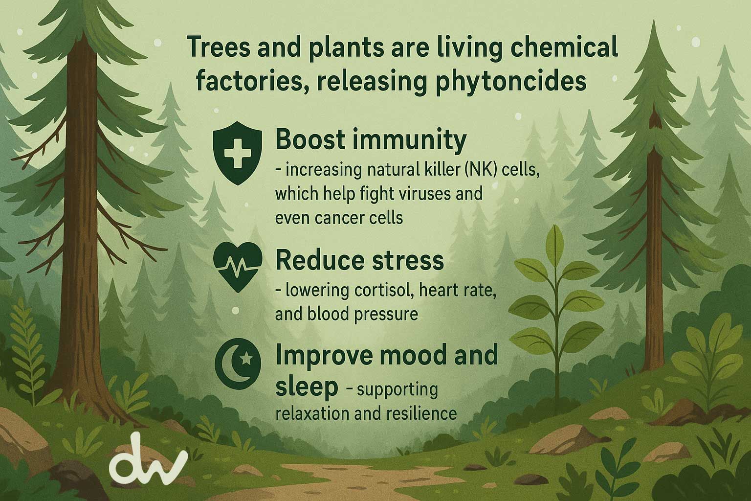 A 2024 global review confirmed these benefits, not only in forests but also indoors where wood oils were present. Earlier research in Japan by Dr. Qing Li showed that essential oils from pines and cedars could strengthen immune responses in controlled trials. In simple terms: when we walk through phytoncide-rich landscapes, the air itself helps train our immune system and calm our nervous system.